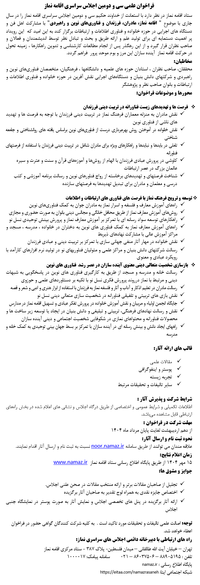 به اطلاع محققان، فرهیختگان و ... می رساند سی و دومین اجلاس سراسری نماز با عنوان " اقامه نماز ، مادران ، فرزندان و فناوری های نوین و راهبردی " برگزار می گردد.