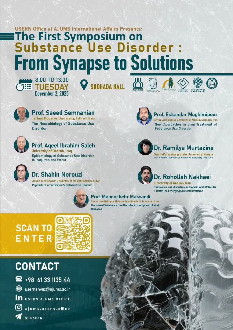 به اطلاع می رساند سمپوزیوم بین المللی با عنوان  "Substance Use Disorders: From Synapses to Solutions" به صورت حضوری - مجازی، توسط مدیریت امور بین الملل دانشگاه علوم پزشکی جندی شاپور اهواز برگزار می گردد.